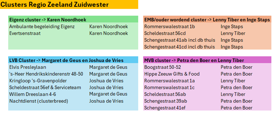 Dit betekent dat er een aantal wisselingen in zorgmanagement heeft plaatsgevonden per 1 januari: zo wordt Inge staps de zorgmanager van Rommerswalestraat 1b, Lenny Tiber van Rommerswalestraat 1a en Petra van Schengestraat 41ef. De overdracht heeft inmiddels plaatsgevonden. Verder worden Scheldestraat 56ef & het Serviceteam toegevoegd aan het LVB cluster.