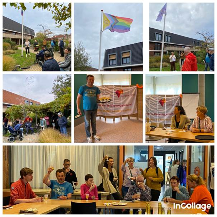 Op 8 oktober vierden we de week van de medezeggenschap en coming-out day middels het hijsen van de vlag en een korte toespraak van de coach bewonersraad en de regiomanager. Daarna hebben we onder een feestelijk drankje en hapje hierbij stilgestaan. Anders dan andere jaren was er daaropvolgend een bijeenkomst met de 2 Cliënt Vertrouwens Personen Inge Lausberg en Iris Kruithof over hun werk. Zij vertelden ook hoe je met hen in contact kunt komen, als dat nodig mocht zijn.