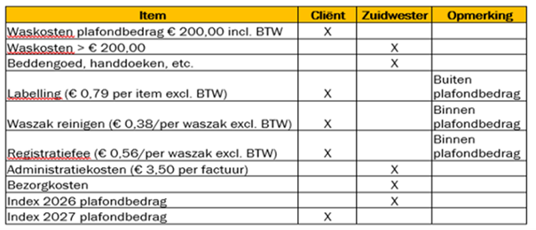 In onderstaande tabel ziet u het verschil in de kosten voor rekening van de cliënt en de kosten voor Zuidwester terug.